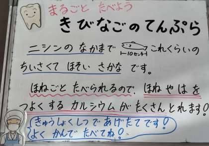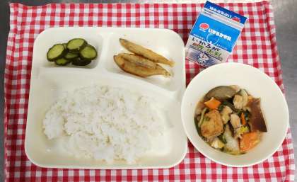 今日は、きびなごてんぷら、厚揚げと野菜の煮もの、きゅうりの甘酢づけ、ごはん、牛乳でした。魚が苦手な子にも丸ごと食べやすく揚げたてのてんぷらは好評でした。