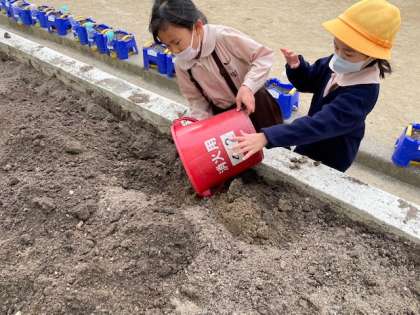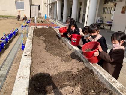 教室前の花壇にチューリップを植えます。4年前の6年生が、枯葉などを入れて作った腐葉土や再生土を、1年生が一生懸命運びました。ここに植える球根は、今年の春咲き終わった後にできた球根です。大宮SDGsの一つです。