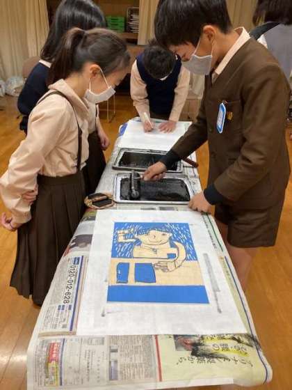 彫り終わった版画を、インクをつけて刷り、仕上げました。