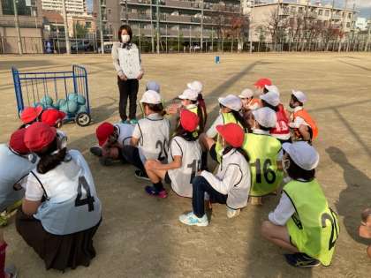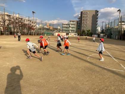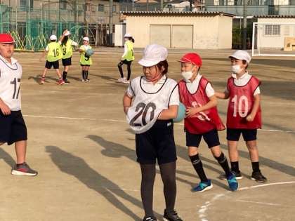 台を使わないでポートボールをしました。ドリブルもなしで、うまくパスを回す練習です。