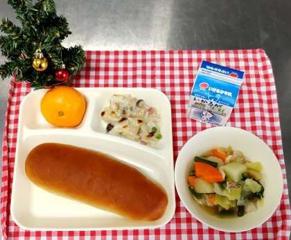 今日は、きのこのドリア、鶏肉とじゃがいものスープ煮、みかん、黒糖パン、牛乳でした。