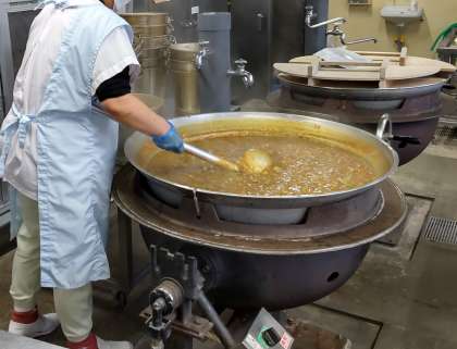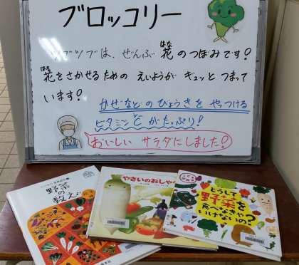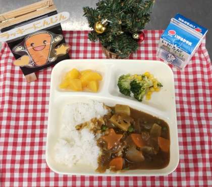 今日は冬野菜のカレーライス、ブロッコリーとコーンのサラダ、黄桃(缶詰)、牛乳でした。旬の野菜がたっぷりの献立です。根野菜の大根とれんこんもカレーに入ると食べれた子がいました。