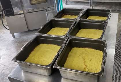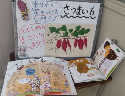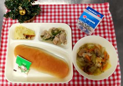 今日は、豚肉と野菜のソテー、スープ、スイートポテト、コッペパン、マーガリン、牛乳でした。