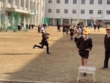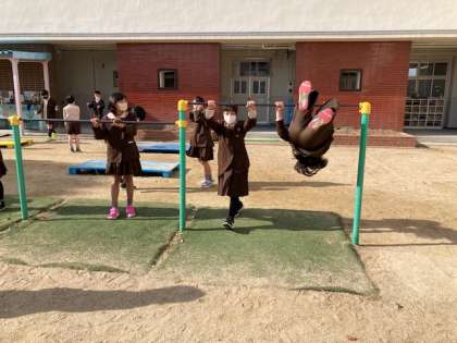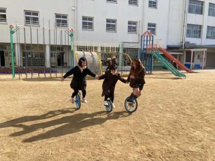 鉄棒や鬼ごっこなどで元気に遊んでいます。一輪車で仲良くメリーゴーランドをしていました。