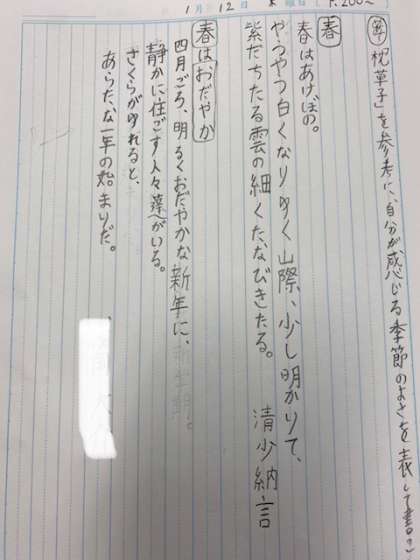 「枕草子」に書かれた四つの季節の中から好きなものを選び、そして、自分ならその季節のどんなところによさを感じるかを書きました。作った文を互いに読み合い感じたことを伝え合いました。