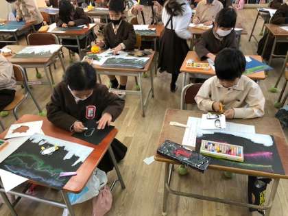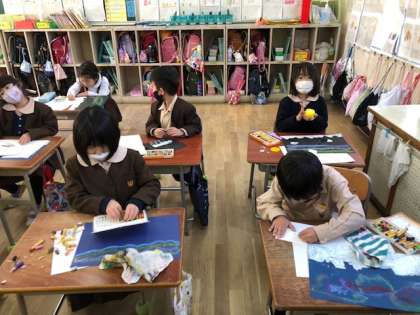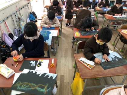 南極にいるペンギンやシロクマなどを描き、絵に貼りました。氷の上で滑ったり、オーロラを見ていたり、それぞれ思いがあるようです。最後は、南極探検をしている自分を描く予定です。