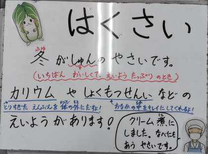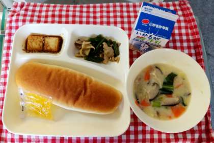 今日は白菜のクリーム煮、あつあげのゴマ醤油かけ、豚肉と三度豆のオイスターソース炒め、コッペパン、マーマレード、牛乳でした。