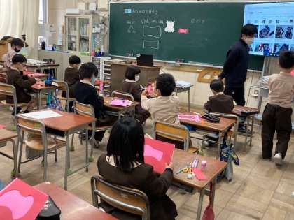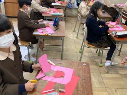 紙版画で鬼をつくっています。口の形を工夫して切っています。