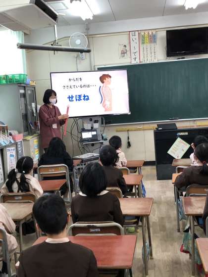 発育測定後に、保健指導を受けました。良い姿勢のポイントや、悪い姿勢だとどうなるのかを教えてもらいました。体がすくすく大きく成長するように、学校でも家でも良い姿勢を意識してほしいです。