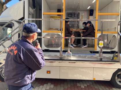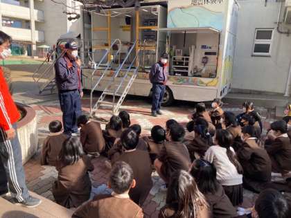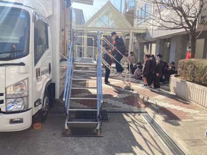 5、6年生は、起震車体験をしました。一番大きい震度7の揺れは想像以上に大きく、
