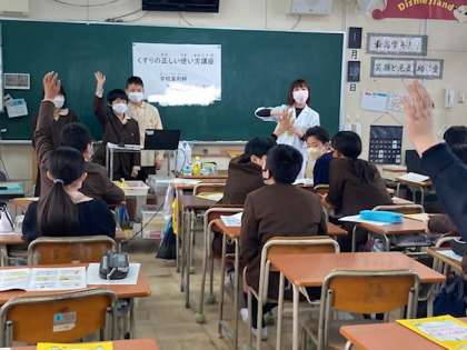 6年生が、学校薬剤師のN先生から、薬についての話を伺いました。薬の間違った飲み方について実験で確かめた後、違法薬物についての話を