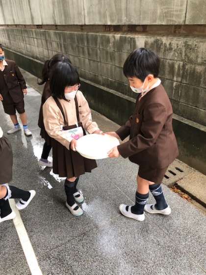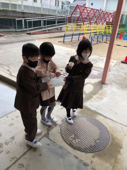 明日朝、寒波が訪れるとのことで、「こおり大さくせん」をしました。水は多い方がいいのか少ない方がいいのか、どこに置けばいいのか、班で相談して決めました。さて、氷はできるでしょうか?お楽しみです。