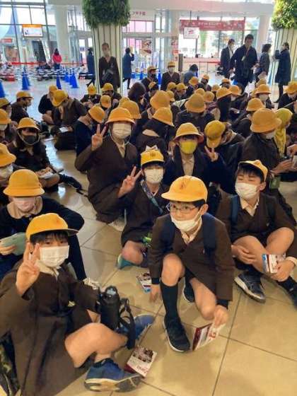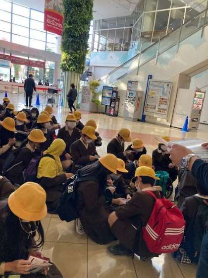 キッザニア甲子園に到着しました。入場まで少し待機します。配布されたものの説明を聞いています。