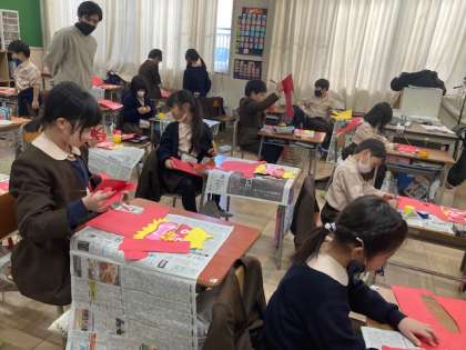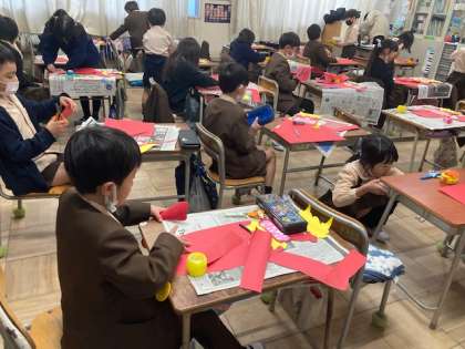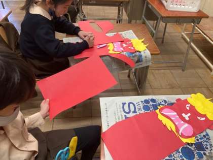 紙版画で鬼の様子を作っています。今日は体と腕の部分を作りました。動きが出るように、首を傾けたり、腕を曲げたりと工夫しました。