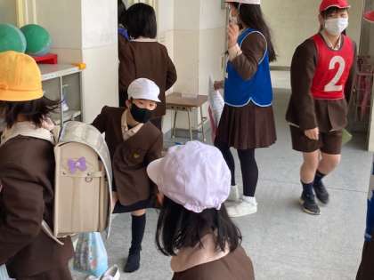 久しぶりの、運動場での児童集会でした。縦割り班の6年生が、8時25分までに、班の1年生を迎えに行っています。