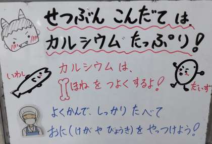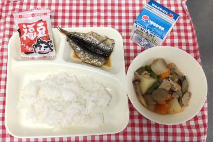 今日は、いわしの生姜醤油かけ、含め煮、いり大豆、ご飯、牛乳の節分献立でした。節分には鬼の嫌がる匂いの鰯の頭を玄関に飾ったり、魔(災い)の芽が出ないように炒った豆を年の数だけ食べたりする風習があります。小骨ごと食べれる鰯や大豆はカルシウムたっぷりで骨を強くし鬼に負けない体をつくりますよ。