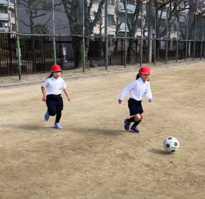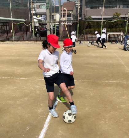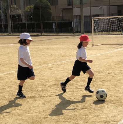 友達と一対一でボールを取り合いっこしました。取られないように守ったり、追いかけて奪ったり、広いグラウンドを走り回りました。