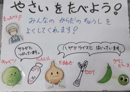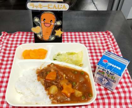 13日の給食は、ハヤシライス、キャベツのバジル風味サラダ、みかん(缶詰)、牛乳でした。小麦粉から手作りのルウはとても優しい味です。野菜もたっぷりで大好評でした。