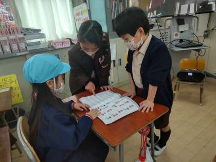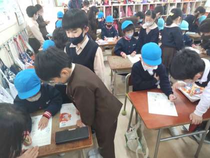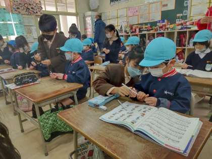 1年生が、幼稚園の子ども達にいろいろ教えてあげました。座り方やあいさつ、礼の仕方、鉛筆の持ち方などなど。一緒に歌を歌ったり推し話を聞いたりしながら楽しい時間を過ごしました。ちょっぴりお兄さん、お姉さんの気分を味わった1年生。2年生になるのももうすぐです。
