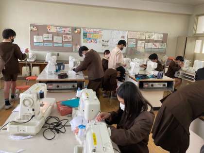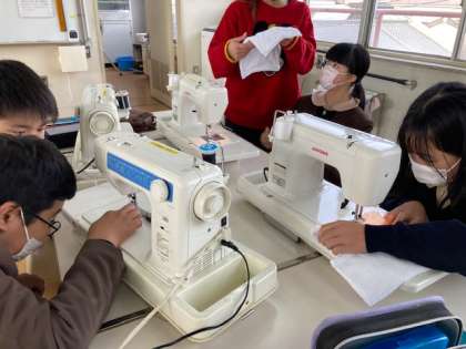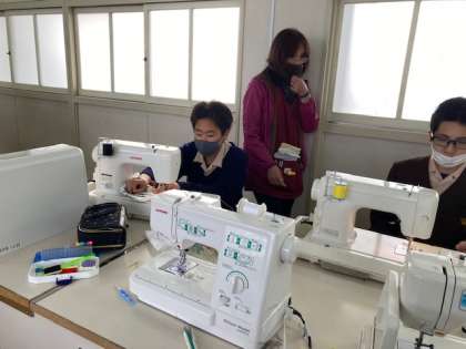 雑巾を縫っています。ミシンがなかなかうまく動かない時もあり、助け合って仕上げています。