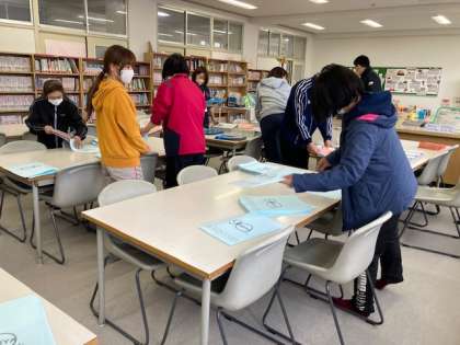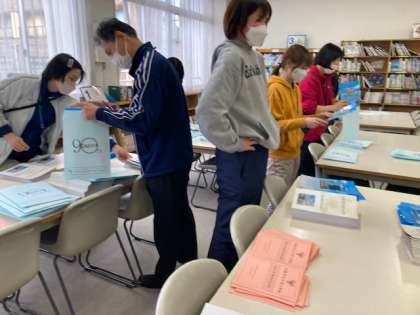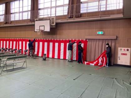 講堂の紅白幕を張ったり、記念誌や記念クリアファイルなどの袋詰めをして準備をしています。