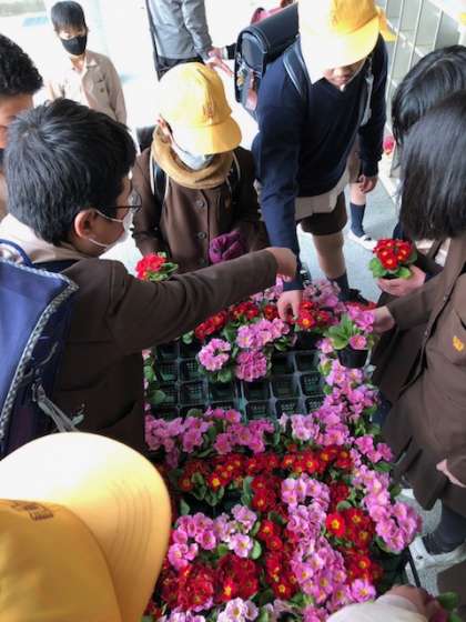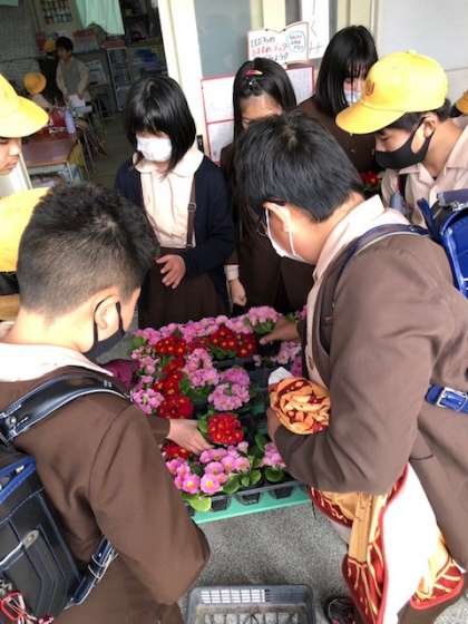 飼育栽培委員会が、90周年式典に向けて、花で90の文字を飾りました。「ここ赤い花おいて」などみんなで声を掛け合って完成させました。