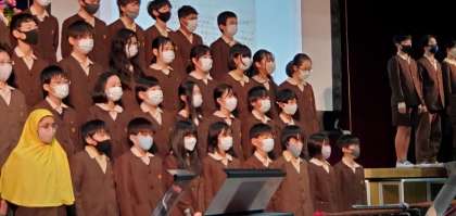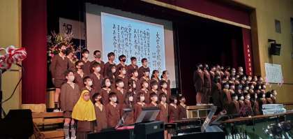 大宮小学校の歴史を述べる中、校歌が誕生した経緯や、講堂に掲示している校歌の銘板が、4年前の高学年で作り上げたことなどを紹介しました。