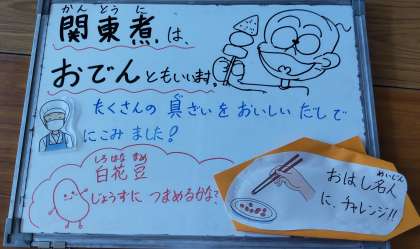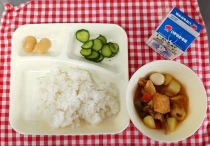 今日は関東煮、きゅうりの梅風味、白花豆の煮物、ご飯、牛乳でした。関東煮はおでんとも呼ばれます。うずら卵の除去食も用意しました。白花豆はベニバナインゲンの豆で、花も豆も白色です。初めて食べて美味しかったと言いに来てくれる子がたくさんいました。