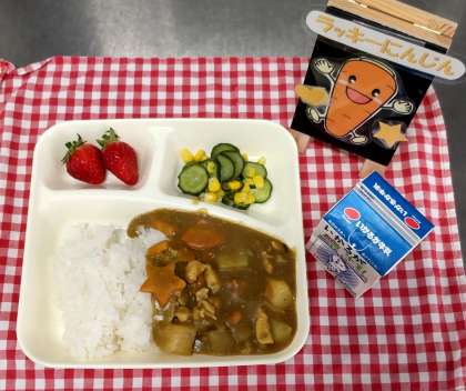 今日はチキンレバーカレーライス、きゅうりとコーンのサラダ、いちご、牛乳でした。日本人に不足しがちな鉄を豊富に含む鶏レバーのペーストを使ったカレーです。昨年の反省を活かして臭みを感じないように工夫しました。「おいしかった。」と好評でしたよ。