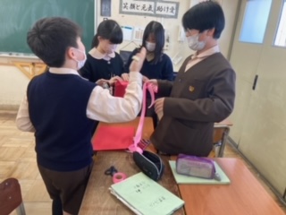 卒業を祝う会で下級生に送るプレゼントの包装をしました。頑張って作ったので喜んでもらえると嬉しいですね。