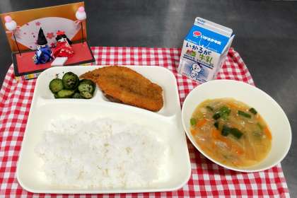 今日はいわしフライ、みそ汁、きゅうりの赤じそあえ、ご飯、牛乳でした。いわしは小骨が多くありましたが、みんなしっかり噛んで丸ごと食べれていました。