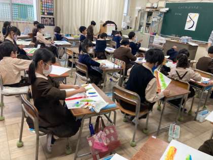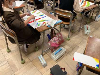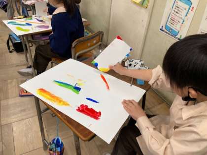 チューブから絵の具を出し、それを紙のヘラで伸ばして模様を作っていきました。