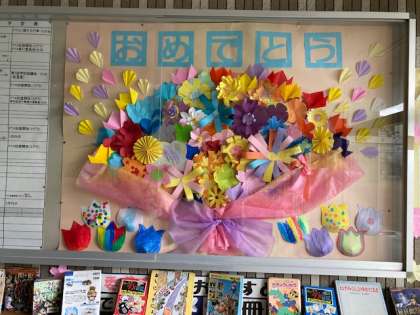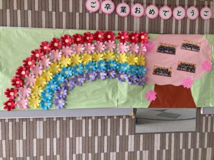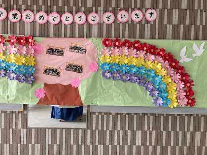 卒業おめでとうの掲示物が玄関にも。よく見ると、6年生が入学した頃の学級写真もあります。懐かしいし、みんなかわいいですね!
