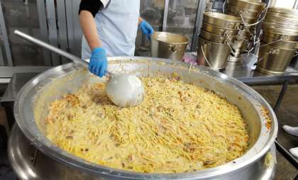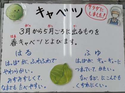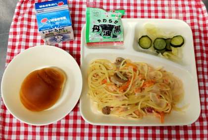今日は、鮭のクリームスパゲッティ、キャベツときゅうりのサラダ、ソフト黒豆、ミニ黒糖パン、牛乳でした。