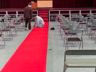 卒業生が歩く中央通路にレッドカーペットを敷きました。管理作業員のIさんが、めくれないようにテープで止めてくださいました。