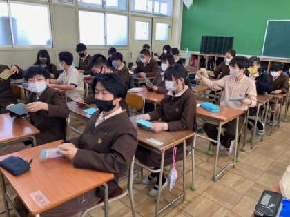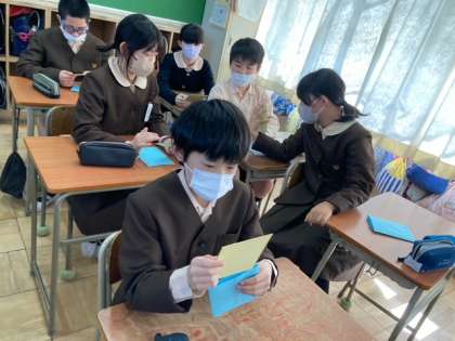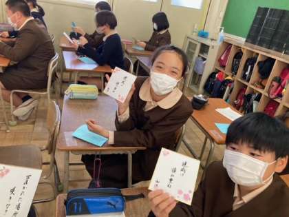 校長先生から卒業プレゼントをいただきました。それぞれの色紙に励ましの言葉が刻まれています。皆、喜んでいました。