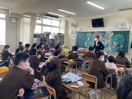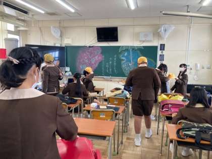 式場から退場した後、最後の学級での時間です。担任が描いた黒板アートがには、温かいメッセージも。