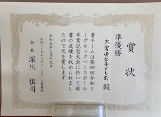 昨日、キックベースボールの卒業記念大会があり、大宮連合子ども会チームは、準優勝しました。6年生のために何としても勝ちたいと、5年生が頑張ったようです。修了式で表彰状を披露します。