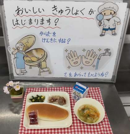 今日から給食が始まりました。初日は豚肉のガーリック焼き、スープ、さんどまめとコーンのサラダ、コッペパン、いちごジャム、牛乳でした。1年生は小学校初めての給食でしたが、しっかり食べてお代わりする子もたくさんいました。