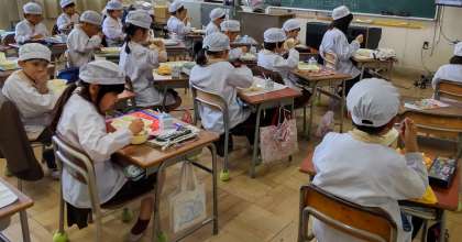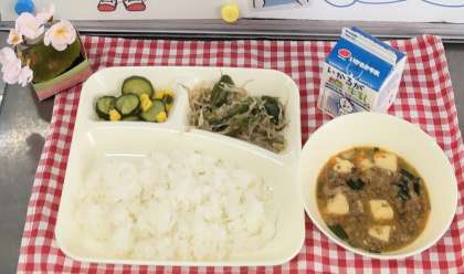 今日は、マーボーどうふ、きゅうりとコーンの甘酢あえ、もやしとピーマンのごまいため、ご飯、牛乳でした。マーボーは一般なものに比べて野菜たっぷりで辛さ控えめです。どのクラスも食缶空っぽでした。