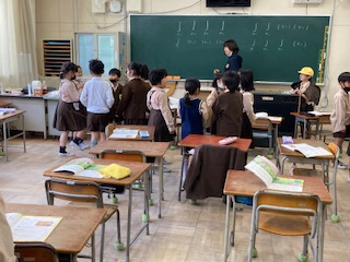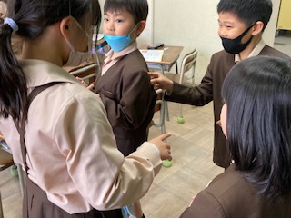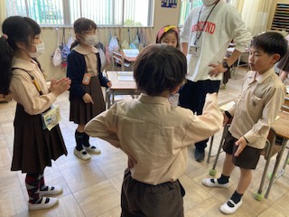 「さんぽ」の曲に合わせて、リズム打ちをしています。グループのみんなで考えて、順に真似をしています。