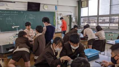 理科の実験では、グループで協力してろうそくの火やせんこうのけむりの不思議について考えていました。