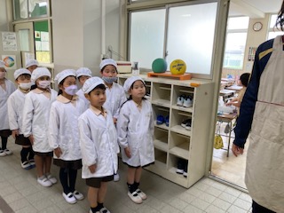 給食当番が給食室に給食を取りに行きます。きちんと並んでいます。