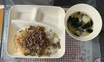 ビビンバは、本場の味に近づけるように肉の具と野菜の具を分けて調理して子ども達がご飯の上に盛り付けて食べました。