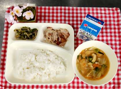 今日は、豚肉のしょうが焼き、みそ汁、じゃこピーマン、ご飯、牛乳でした。ちりめんじゃことピーマンは苦手な児童もいる食材ですが、合わせて調理するとご飯が進む人気メニューになります。カルシウムもたっぷりです。