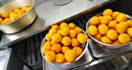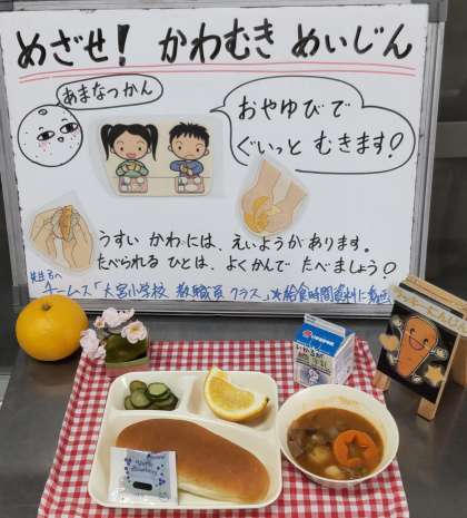 今日はビーフシチュー、きゅうりのサラダ、甘夏かん、コッペパン、ブルーベリージャム、牛乳でした。大阪市の給食はシチューのルウも小麦粉から手作りします。たくさんの甘夏かんが届き爽やかな香りが漂っていました。