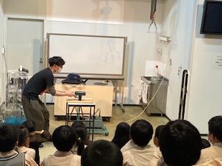 サイエンスショーを見ました。空気の力についての実験です。吸盤がなぜくっつくのか、持ち上げるのはどれくらいの力があるのかなどを確かめました。