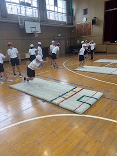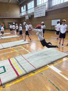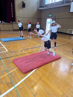 新体力テストに向けて、立ち幅跳びの練習をしました。遠くまで跳ぶことが出来た友達の様子をヒントにしました。最後は今の時点でのだいたいの記録をとりました。本番までにしっかり体力をつけましょう!