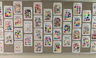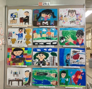 廊下に図工の作品を掲示しています。1年生は、「びんの中のドロップ」2年生は、「好きなこと」です。教室の中にも掲示しています。