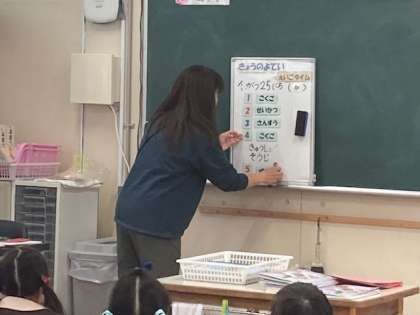 今日の予定をホワイトボードに書いて、見通しを持たせています。すっかり慣れてきた子どもたちは、チャイムの合図で次の学習の準備をしています。